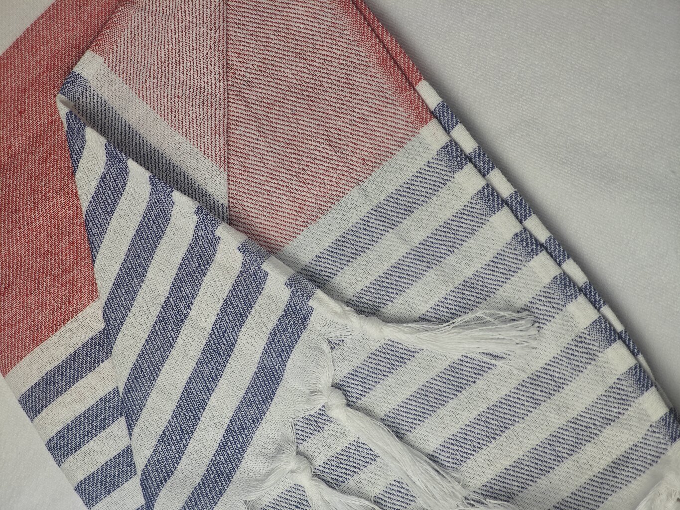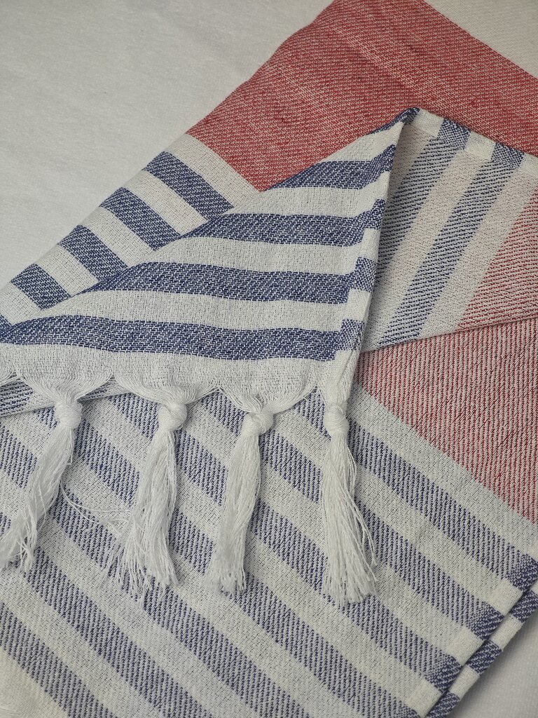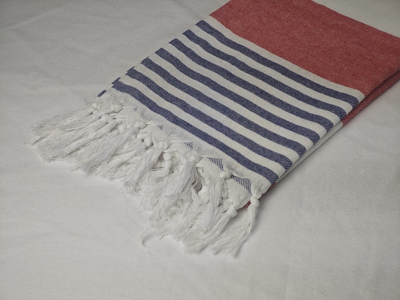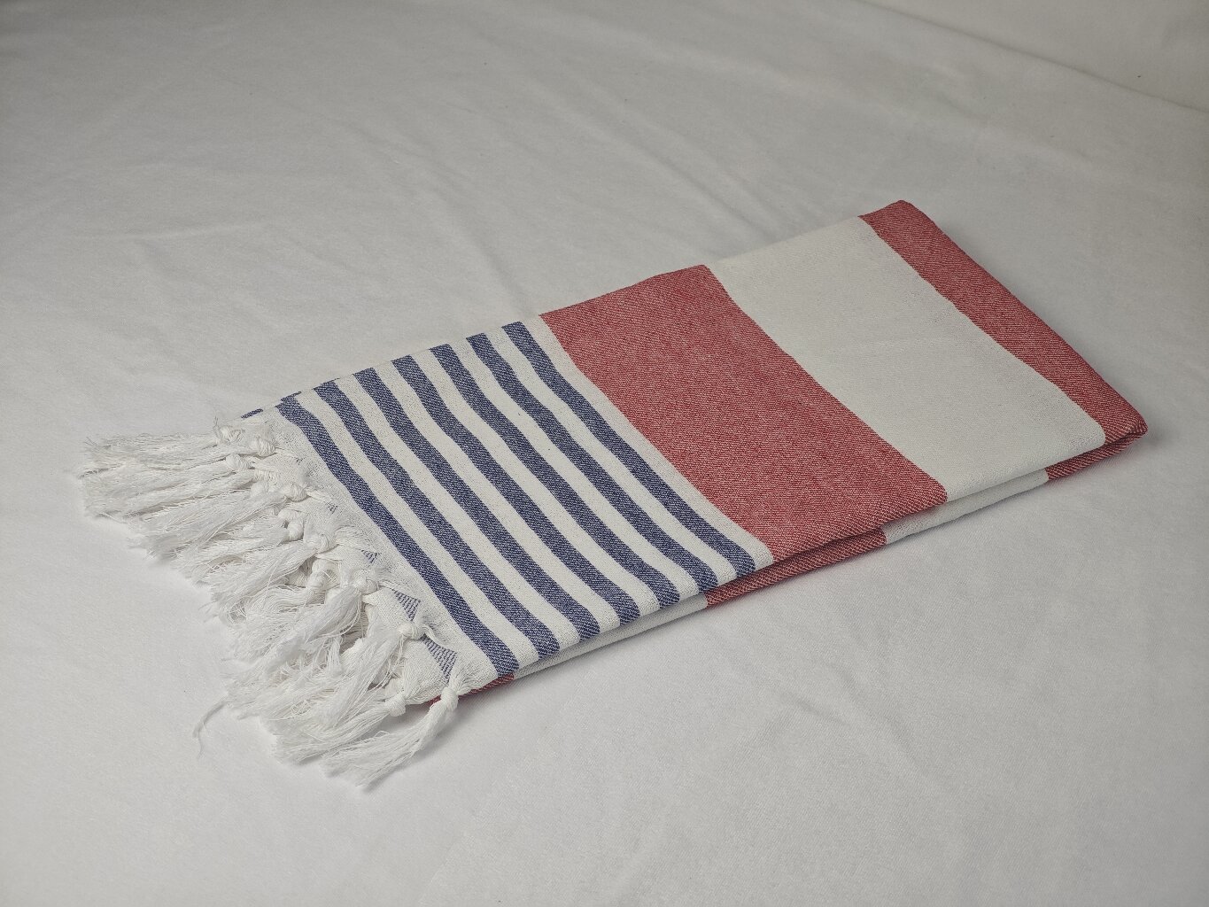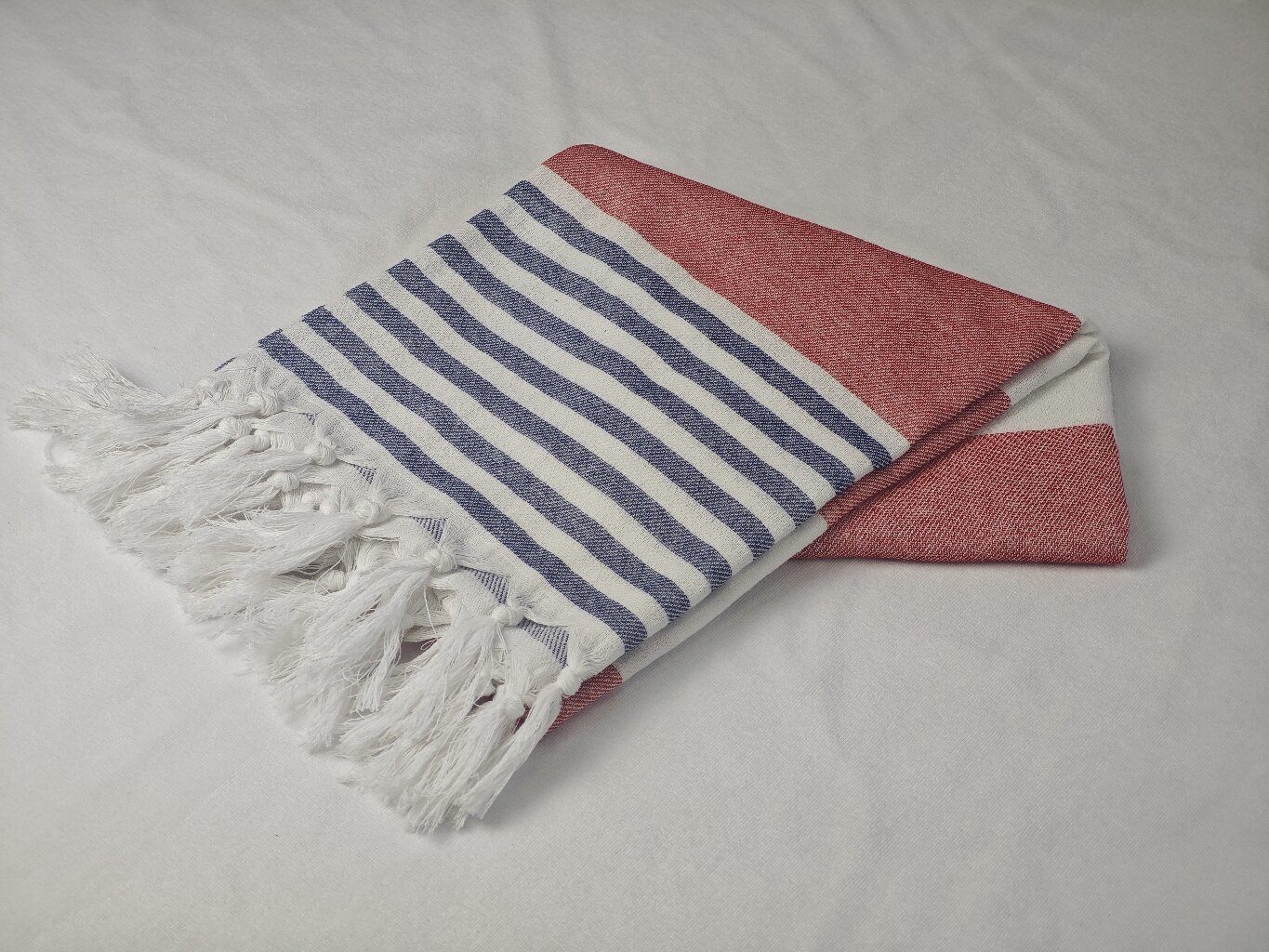 This Turkish beach towel made from premium cotton, boasts a vibrant red and white striped pattern with stylish blue accents, exuding a classic nautical charm. Equipped with soft tassels at both ends, it not only enhances visual appeal but also ensures durability.
