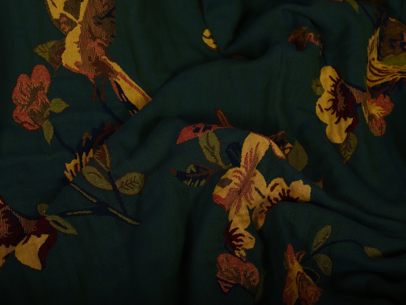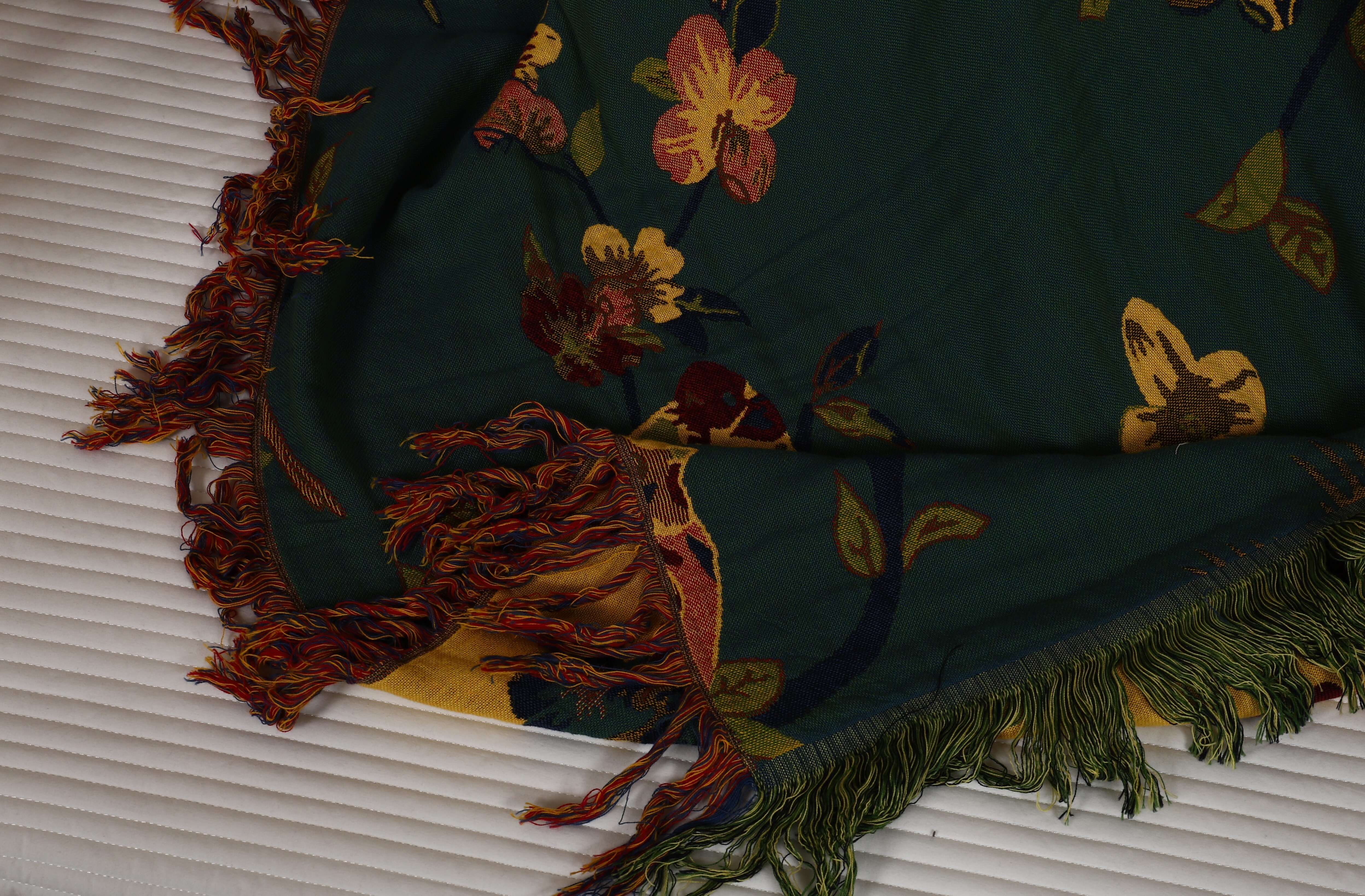 A vibrant green towel blanket, adorned with intricate floral and bird motifs in warm gold, red, and yellow hues, exudes bohemian elegance. Its fringed edges add a playful touch, while the ultra-soft, lightweight fabric ensures all-day comfort.